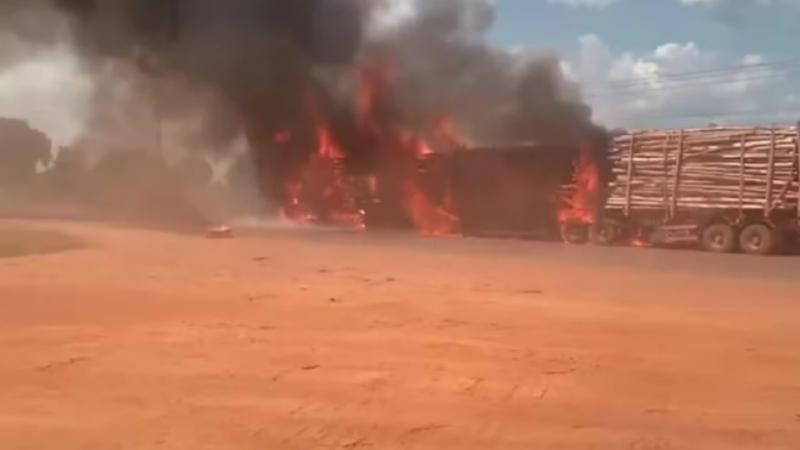 Carreta carregada de eucalipto pega fogo na Estrada do Arroz, em Imperatriz