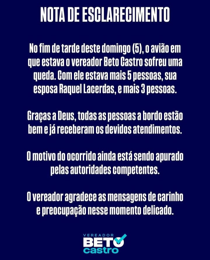 Em nota divulgada nas redes sociais do vereador, foi informado que todos os ocupantes passam bem e receberam atendimento médico. A publicação agradeceu as mensagens de apoio e informou que as causas do acidente estão sendo apuradas pelas autoridades competentes.