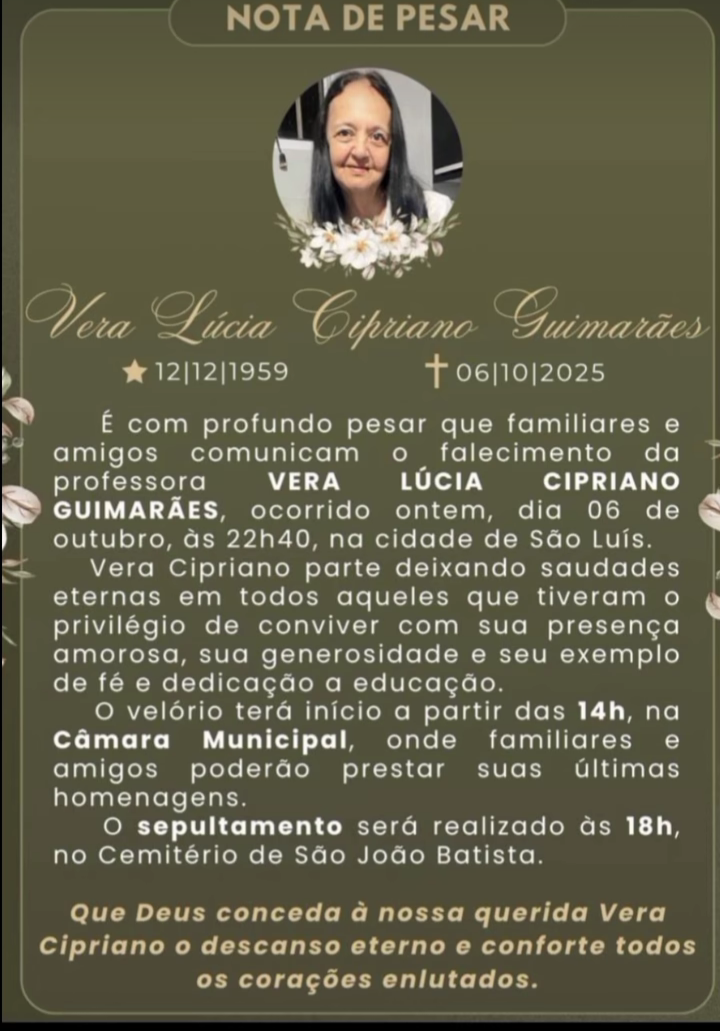 É com grande comoção que familiares, amigos e ex-alunos se despedem da professora Vera Lúcia Cipriano Guimarães, que faleceu na noite de ontem, domingo (6), às 22h40, na cidade de São Luís.