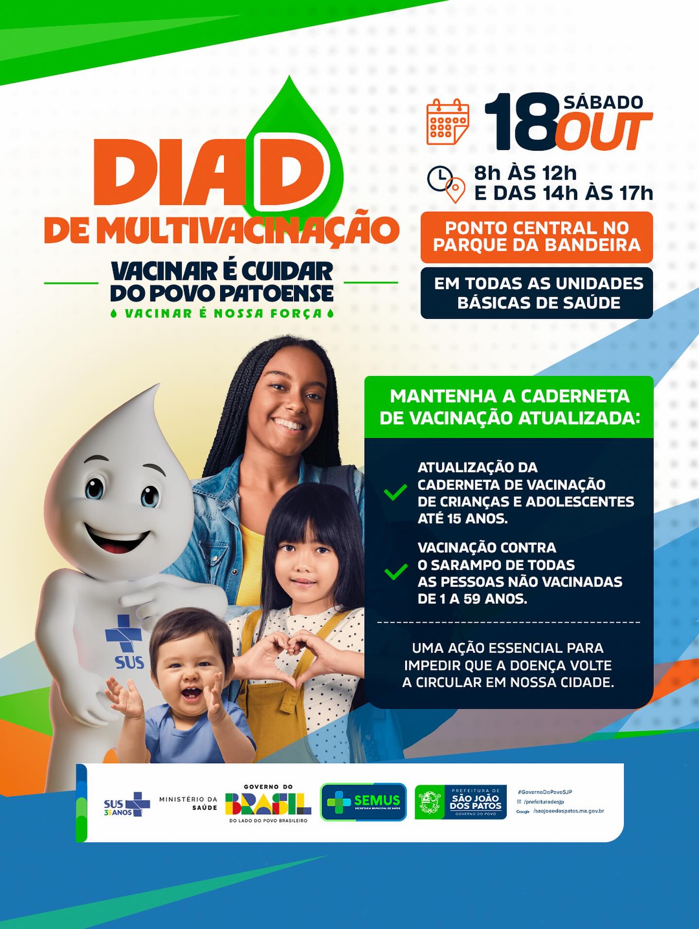 A Prefeitura de São João dos Patos, por meio da Secretaria Municipal de Saúde, realiza neste sábado, 18 de outubro, o Dia D de Multivacinação, uma grande mobilização para atualizar a caderneta de vacinação de crianças, adolescentes e adultos.