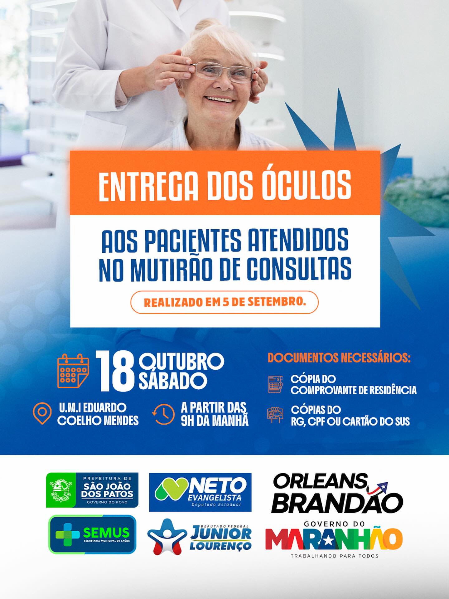 A Prefeitura de São João dos Patos, por meio da Secretaria Municipal de Saúde (SEMUS), realiza neste sábado, 18 de outubro, a entrega dos óculos aos pacientes atendidos no Mutirão de Consultas, realizado no último dia 5 de setembro.