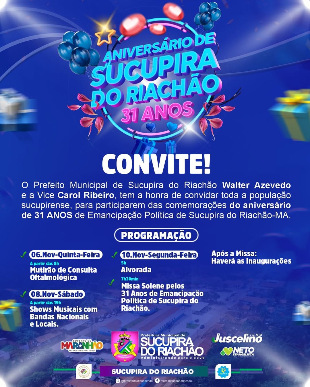 “Sucupira do Riachão é feita de um povo trabalhador, acolhedor e cheio de fé. Celebrar 31 anos de emancipação é celebrar conquistas, superações e o compromisso diário de cuidar da nossa gente. Preparamos esta programação com muito carinho, pensando em cada sucupirense. Parabéns, Sucupira do Riachão, que venham muitos outros anos de avanços e união.”