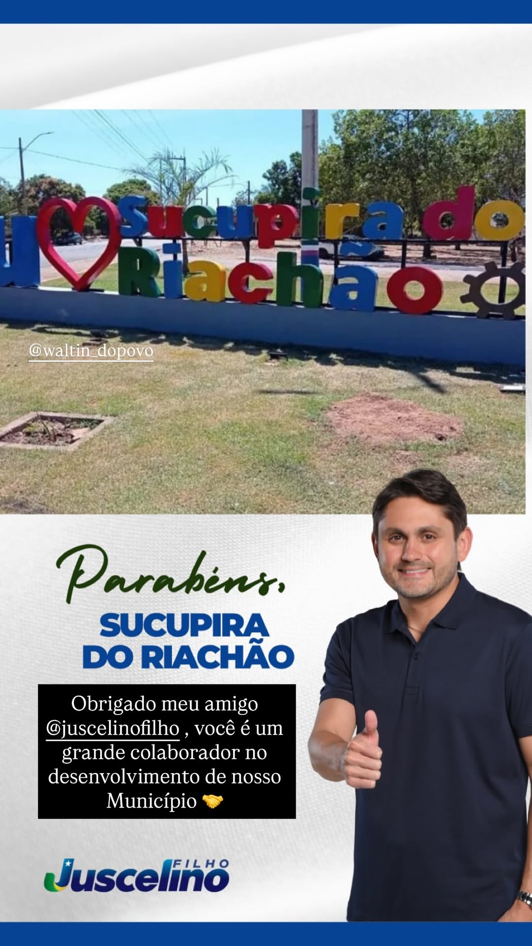 Nossa história é feita de desafios superados e de momentos que reafirmam nossa capacidade de seguir em frente, sempre juntos. Parabéns a cada cidadão e cidadã, que com seus sonhos e dedicação fazem nossa cidade pulsar e crescer. Que sigamos honrando nossas raízes e construindo um futuro ainda mais promissor para a nossa querida Sucupira do Riachão. Feliz aniversário, minha amada cidade.”
