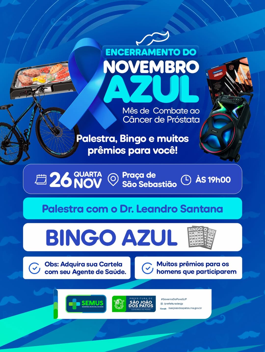 A campanha Novembro Azul, dedicada à prevenção e ao combate ao câncer de próstata, terá um encerramento especial em São João dos Patos. A Prefeitura, por meio da Secretaria Municipal de Saúde, preparou uma noite voltada à informação, conscientização e integração da comunidade masculina.