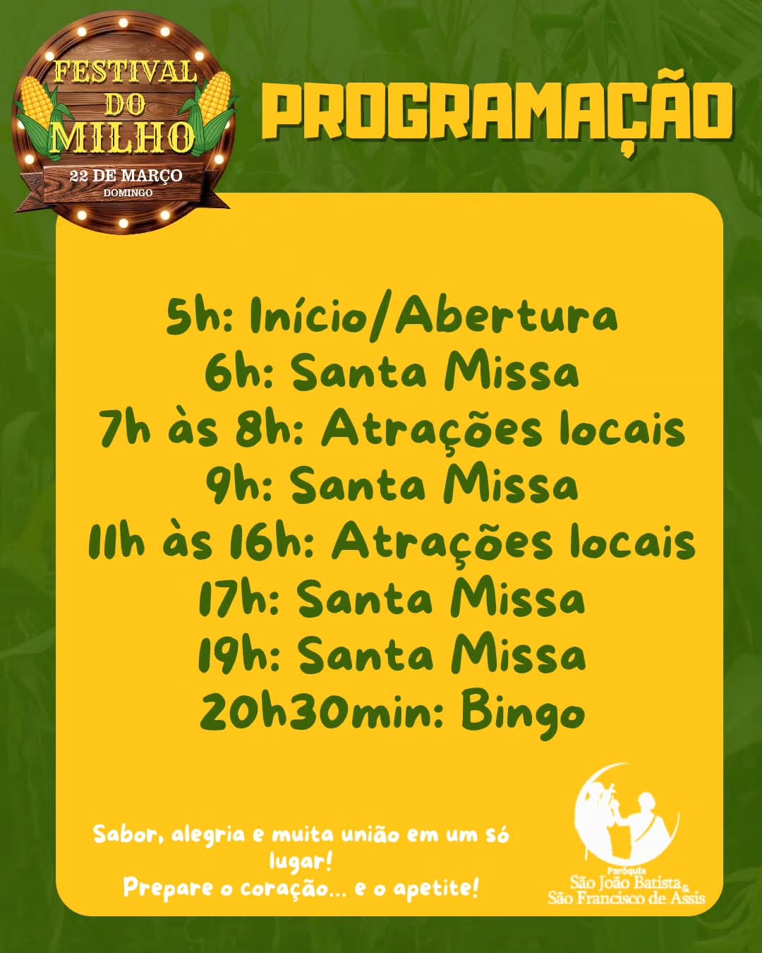 O evento é promovido pela Paróquia São João Batista e São Francisco de Assis e tem como proposta fortalecer a união da comunidade, valorizar a cultura local e proporcionar um momento especial de convivência.