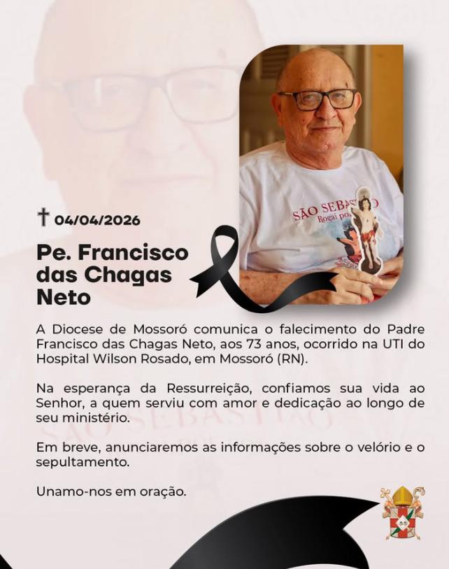 A Diocese de Mossoró confirmou, neste sábado (04), o falecimento do padre Francisco das Chagas Neto, aos 73 anos. O religioso estava internado na UTI do Hospital Wilson Rosado, na cidade de Mossoró, onde veio a óbito.