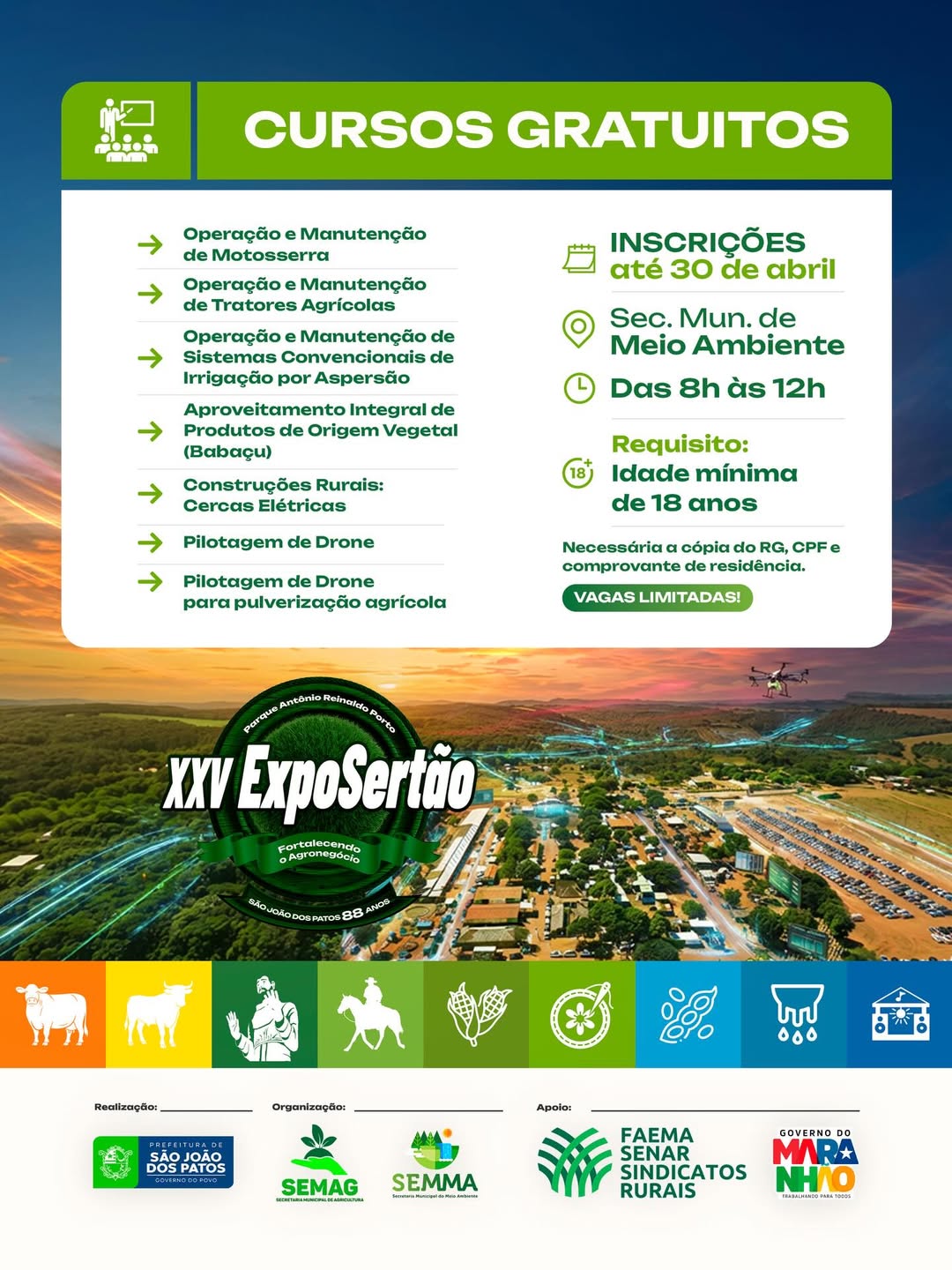 A ExpoSertão chega à sua 25ª edição com uma grande oportunidade para quem deseja se qualificar e crescer no setor agropecuário. Em São João dos Patos, serão ofertados diversos cursos gratuitos voltados à capacitação técnica e ao fortalecimento do agronegócio na região.