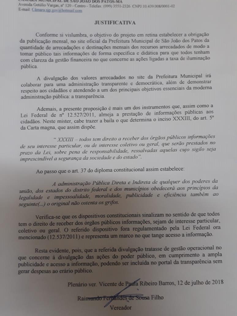 O vereador Raimundo Filho(PRB) propôs na sessão da Câmara Municipal desta última segunda-feira(17) um projeto de lei que visa obrigar a prefeitura divulgar em seu portal da transparência os valores arrecadados com a taxa de iluminação pública.