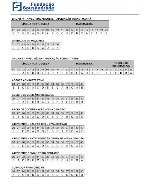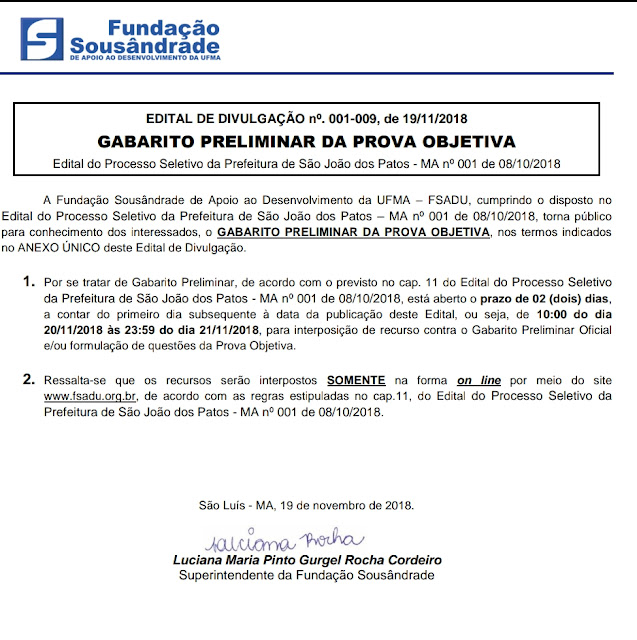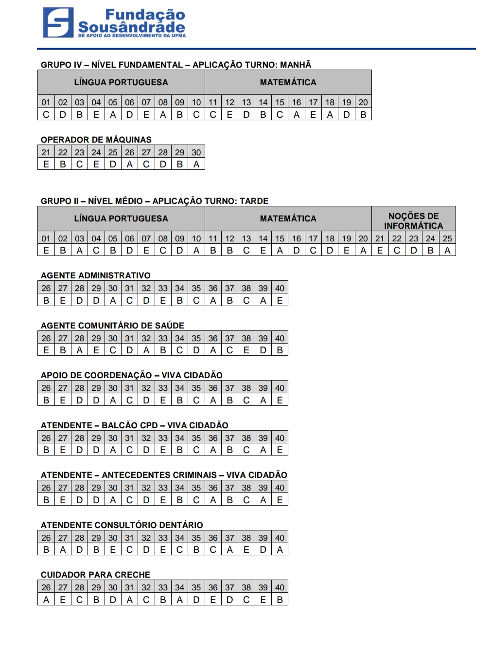 A Fundação Sousândrade, responsável pela execução do Seletivo da Prefeitura de São João dos Patos acabou de divulgar o gabarito oficial do certame. As provas ocorreram ontem na cidade. Confira aqui os resultados.