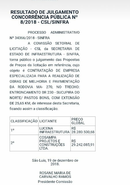 CONSTRUTORA LUCENA É A VENCEDORA E VAI ASFALTAR A MA-270 ENTRE SUCUPIRA DO NORTE E PASTOS BONS