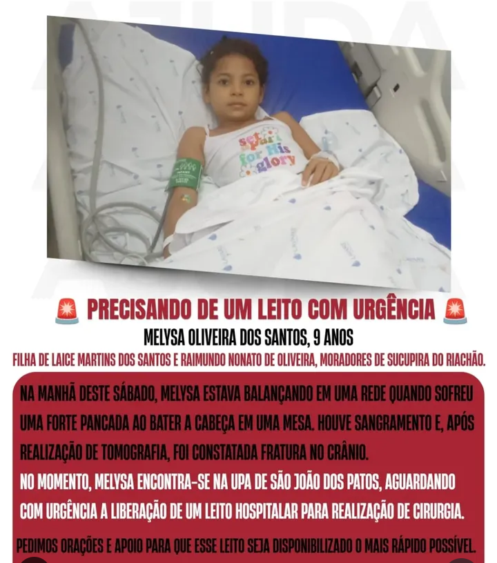 SÃO JOÃO DOS PATOS / SUCUPIRA DO RIACHÃO – A menina Melysa Oliveira dos Santos, de 9 anos, aguarda com urgência a liberação de um leito hospitalar na Unidade de Pronto Atendimento (UPA) de São João dos Patos. A criança sofreu uma fratura no crânio após um acidente doméstico ocorrido na manhã deste sábado, em sua residência, no município de Sucupira do Riachão.