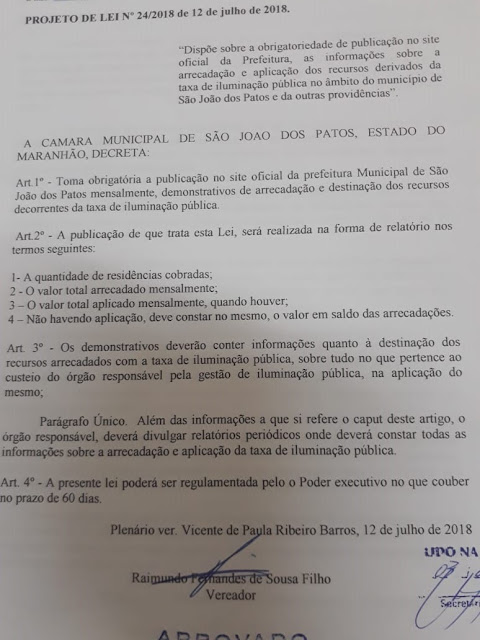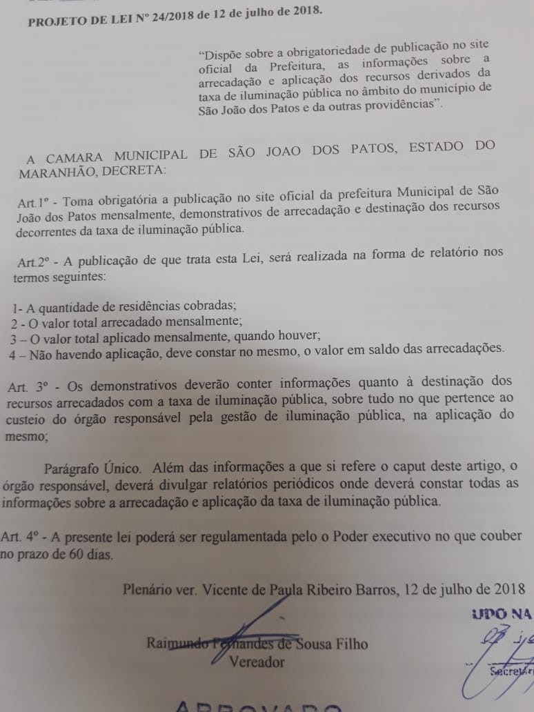 O vereador Raimundo Filho(PRB) propôs na sessão da Câmara Municipal desta última segunda-feira(17) um projeto de lei que visa obrigar a prefeitura divulgar em seu portal da transparência os valores arrecadados com a taxa de iluminação pública.