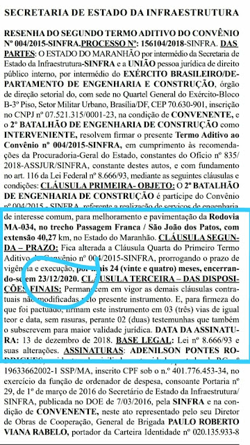 A Secretaria de Estado de Infraestrutura(Sinfra) e o Exército Brasileiro através do 2° BEC(Batalhão de Engenharia e Construção) definiram o prazo limite para a conclusão do trecho da MA-034 entre São João dos Patos e Passagem Franca.