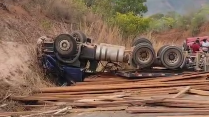 Caminhão carregado de madeira tomba e bloqueia totalmente rodovia entre São Domingos do Azeitão e Benedito Leite/Uruçuí